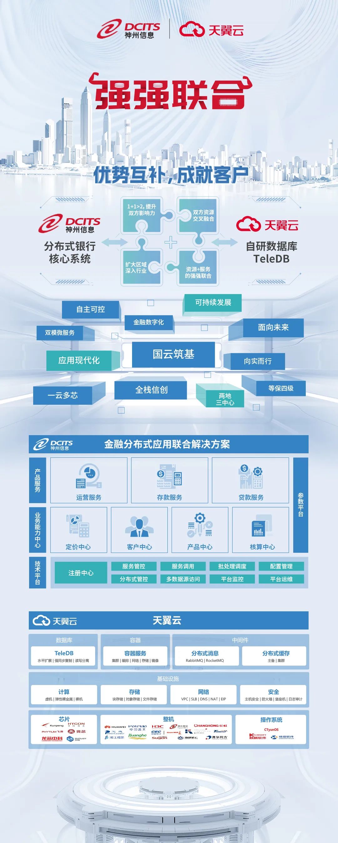 双方表示,基于“国云”环境,期待为国内银行提供安全、高效、稳定的“银行分布式核心业务系统”建设,更好的推动银行数字化转型。