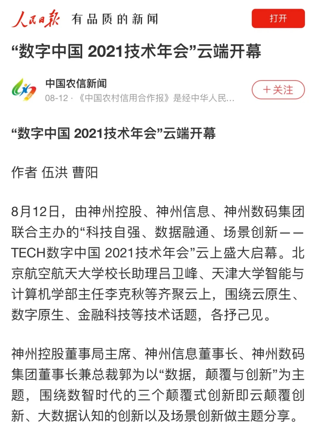 8月12日,由神州控股、BB贝博艾弗森官网、bb贝博艾弗森集团联合主办的“科技自强、数据融通、场景创新——TECH数字中国 2021技术年会”云上盛大启幕,发布神州信创云、ModelB@nk5.0、金融超脑Sm@rtFSB、云原生数字化安全底座、园区智能体等重磅产品,国内各大权威、影响力媒体多角度多频次对盛况进行报道!
