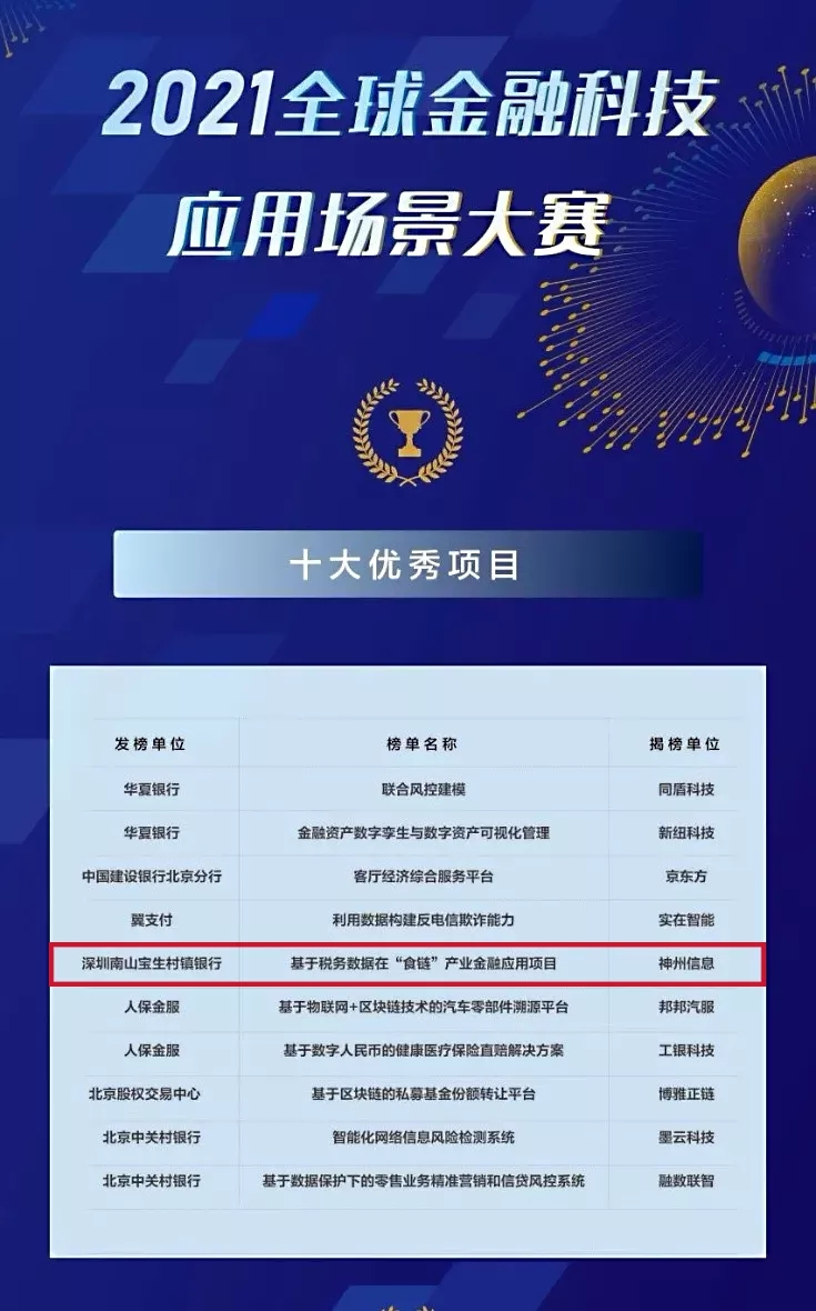 9月29日,2021全球金融科技应用场景大赛(以下简称“大赛”)总路演在北京新动力金融科技中心成功举办,本届金融科技应用场景大赛圆满落幕。由深圳南山宝生村镇银行发榜,BB贝博艾弗森官网揭榜的“基于税务数据在‘食链’产业金融应用项目”荣获十大优秀项目奖。